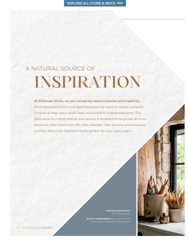 (MIDDLE) ROUGHCUT®IN CASA BLANCA(RIGHT) TUNDRABRICK® IN LATIGO® WITH WHITEWASH OVERGROUT TECHNIQUE7 | 2023 SOURCE BOOK VOLUME 2 At Eldorado Stone, we are moved by nature’s power and creativity. Each stone and brick is handpainted piece-by-piece to create authentic finishes so that every space feels connected to organic elements. This dedication to craftsmanship and service is threaded throughout all of our products. With more than 150 color palettes, crisp textures and extensive profiles, there is an Eldorado Stone perfect for your next project.A NATURAL SOURCE OF INSPIRATIONEXPLORE ALL STONE & BRICK >>>