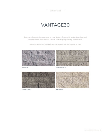 ELDORADOSTONE.COM | 18Bring an element of movement to your design. The gentle textural surface and uniform linear lines deliver a clean and unique planking appearance.VANTAGE30HEIGHT: 6\CUMULUSĀ® SOUTHERN PEAKSTORMCLOUD WHITE ELMNATIONWIDE