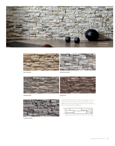 ELDORADOSTONE.COM | 30STACKED STONEIN KORYAK RIDGE™4\8\DRY CREEK® KORYAK RIDGE™NANTUCKET SANTA FESILVER LININGIndividual Stacked Stone panels vary greatly in the cut shapes within their layouts and are available in three different lengths to help avoid repetition while offering quick and convenient installation.