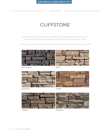 35 | 2023 SOURCE BOOK VOLUME 2 Complement a variety of modern looks with refined, flat-planed faces and distinctive textural details. This stone is available in an array of graceful and modern colors. HEIGHT: 1.25\, 4.5\BARLEYCAMBRIAMANZANITA®CLIFFSTONE®BOARDWALKLANTANA®BANFF SPRINGSNATIONWIDEEXPLORE ALL STONE & BRICK >>>
