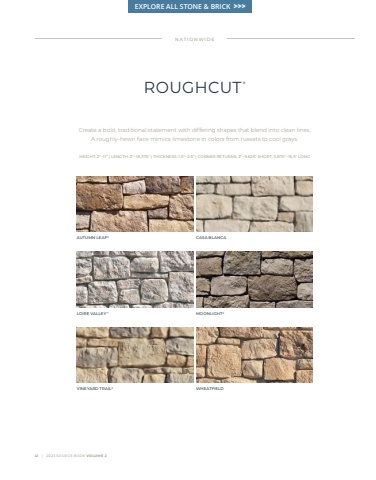 41 | 2023 SOURCE BOOK VOLUME 2 Create a bold, traditional statement with differing shapes that blend into clean lines. A roughly-hewn face mimics limestone in colors from russets to cool grays. HEIGHT: 2\15.5\NATIONWIDEROUGHCUT ®AUTUMN LEAF® CASA BLANCALOIRE VALLEY™ MOONLIGHT®VINEYARD TRAIL® WHEATFIELDEXPLORE ALL STONE & BRICK >>>