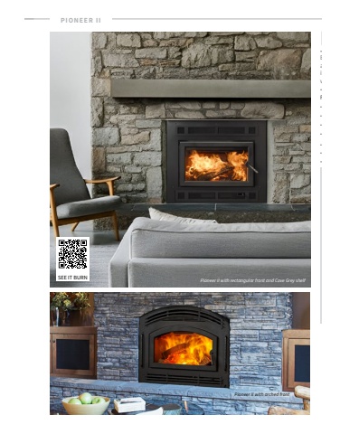 FEATURES AND BENEFITS• 22\• Up to 8 hours of burn time from each load of wood• Available with arch or rectangular front• Heats 1,000-2,600 sq. ft. with 81,000 BTUs, based on climate and home efficiency • High performance dual fans with adjustable speed controls distribute a constant flow of heat• Certified to EPA 2020 emissions standard PIONEER IIEnjoy hassle-free performance that’s ideal for everyday use. The efficiency of the EPAapproved Pioneer II supplies long burn times with nonstop rolling flames. Never has it been easier to set the mood for relaxing or just keeping your home or cabin toasty warm. PIONEER IIFront View Side View Top ViewFRONT WIDTH BACK WIDTH HEIGHT DEPTHFIREBOX OPENINGUnit Framing Unit Framing Unit Framing Unit Framing40[1016]42-1/2 [1080]40[1016]42-1/2 [1080] 40-1/2[1029]56-3/4[1441]23-1/2[597]24[610] 27-3/8 x 16-3/4 [695 x 425]12-3/4\[324]23-1/2\[597]1/2\5-7/8\[149]31-1/8\40-1/2\[1029]16\56-1/2\[1435]12\16-3/4\27-3/8\37\40\1\[25]1\[25]42\9-3/4\7-3/8\1\[25]12-3/4\[324]23-1/2\[597]1/2\5-7/8\[149]31-1/8\40-1/2\[1029]16\56-1/2\[1435]12\16-3/4\27-3/8\37\40\1\[25]1\[25]42\9-3/4\7-3/8\1\[25]12-3/4\[324]23-1/2\[597]1/2\5-7/8\[149]31-1/8\40-1/2\[1029]16\56-1/2\[1435]12\16-3/4\27-3/8\37\40\1\[25]1\[25]42\9-3/4\7-3/8\1\[25]POSSIBLE HEAT ZONE DUCT RUNSPossible Heat Zone Duct RunsCeiling RegisterWall RegisterFloor RegisterTwo Duct KitsCeiling Register12\from register to ceilingHEAT MANAGEMENTOptional Heat Zone KitAvailable on Pioneer III, Pioneer II,and NorthstarWith zone heating, you can easily reduce your energy consumption by up to 40%, and reduce your utility bill in the process. Using a Heat&Glo fireplace as a supplemental heating source, you can turn down your central furnace or boiler system and still maintain comfortable temperatures in your common living area. SEE IT BURN Pioneer II with rectangular front and Cove Grey shelfPioneer II with arched front* Tested to EPA standards, the Pioneer II fireplace meets the strictest environmental standards for wood-burning fireplaces and can be used in areas where conventional wood-burning appliances are restricted or banned.** If interior of chase will be drywalled, add the thickness to this measurement.