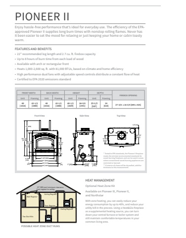 FEATURES AND BENEFITS• 22\• Up to 8 hours of burn time from each load of wood• Available with arch or rectangular front• Heats 1,000-2,600 sq. ft. with 81,000 BTUs, based on climate and home efficiency • High performance dual fans with adjustable speed controls distribute a constant flow of heat• Certified to EPA 2020 emissions standard PIONEER IIEnjoy hassle-free performance that’s ideal for everyday use. The efficiency of the EPAapproved Pioneer II supplies long burn times with nonstop rolling flames. Never has it been easier to set the mood for relaxing or just keeping your home or cabin toasty warm. PIONEER IIFront View Side View Top ViewFRONT WIDTH BACK WIDTH HEIGHT DEPTHFIREBOX OPENINGUnit Framing Unit Framing Unit Framing Unit Framing40[1016]42-1/2 [1080]40[1016]42-1/2 [1080] 40-1/2[1029]56-3/4[1441]23-1/2[597]24[610] 27-3/8 x 16-3/4 [695 x 425]12-3/4\[324]23-1/2\[597]1/2\5-7/8\[149]31-1/8\40-1/2\[1029]16\56-1/2\[1435]12\16-3/4\27-3/8\37\40\1\[25]1\[25]42\9-3/4\7-3/8\1\[25]12-3/4\[324]23-1/2\[597]1/2\5-7/8\[149]31-1/8\40-1/2\[1029]16\56-1/2\[1435]12\16-3/4\27-3/8\37\40\1\[25]1\[25]42\9-3/4\7-3/8\1\[25]12-3/4\[324]23-1/2\[597]1/2\5-7/8\[149]31-1/8\40-1/2\[1029]16\56-1/2\[1435]12\16-3/4\27-3/8\37\40\1\[25]1\[25]42\9-3/4\7-3/8\1\[25]POSSIBLE HEAT ZONE DUCT RUNSPossible Heat Zone Duct RunsCeiling RegisterWall RegisterFloor RegisterTwo Duct KitsCeiling Register12\from register to ceilingHEAT MANAGEMENTOptional Heat Zone KitAvailable on Pioneer III, Pioneer II,and NorthstarWith zone heating, you can easily reduce your energy consumption by up to 40%, and reduce your utility bill in the process. Using a Heat&Glo fireplace as a supplemental heating source, you can turn down your central furnace or boiler system and still maintain comfortable temperatures in your common living area. SEE IT BURN Pioneer II with rectangular front and Cove Grey shelfPioneer II with arched front* Tested to EPA standards, the Pioneer II fireplace meets the strictest environmental standards for wood-burning fireplaces and can be used in areas where conventional wood-burning appliances are restricted or banned.** If interior of chase will be drywalled, add the thickness to this measurement.
