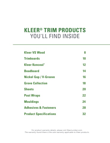 KLEER® TRIM PRODUCTSYOU'LL FIND INSIDEKleer VS Wood 8Trimboards 10Kleer Konceal®12Beadboard 14Nickel Gap / V-Groove 16Grove Collection 18Sheets 20Post Wraps 22Mouldings 24Adhesives & Fasteners 28Product Specifications 32For product warranty details, please visit KleerLumber.com.The warranty found there is the sole warranty applicable to Kleer products.