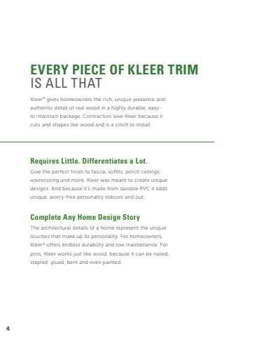 KleerĀ® gives homeowners the rich, unique presence and authentic detail of real wood in a highly durable, easyto-maintain package. Contractors love Kleer because it cuts and shapes like wood and is a cinch to install.Requires Little. Differentiates a Lot.Complete Any Home Design StoryGive the perfect finish to fascia, soffits, porch ceilings, wainscoting and more. Kleer was meant to create unique designs. And because it's made from durable PVC it adds unique, worry-free personality indoors and out.EVERY PIECE OF KLEER TRIMIS ALL THATThe architectural details of a home represent the unique touches that make up its personality. For homeowners, KleerĀ® offers endless durability and low maintenance. For pros, Kleer works just like wood, because it can be nailed, stapled, glued, bent and even painted.4