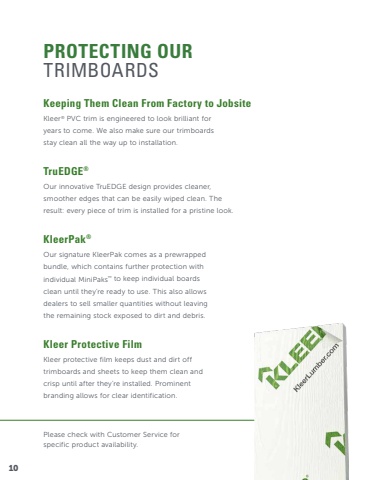 PROTECTING OURTRIMBOARDSKleer® PVC trim is engineered to look brilliant for years to come. We also make sure our trimboards stay clean all the way up to installation.Our innovative TruEDGE design provides cleaner, smoother edges that can be easily wiped clean. The result: every piece of trim is installed for a pristine look.Our signature KleerPak comes as a prewrapped bundle, which contains further protection with individual MiniPaks™ to keep individual boards clean until they're ready to use. This also allows dealers to sell smaller quantities without leaving the remaining stock exposed to dirt and debris.Kleer protective film keeps dust and dirt off trimboards and sheets to keep them clean and crisp until after they're installed. Prominent branding allows for clear identification.Keeping Them Clean From Factory to JobsiteTruEDGE®KleerPak®Kleer Protective FilmPlease check with Customer Service for specific product availability.10