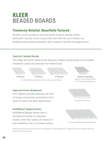 Edge and Center BeadboardThis traditional profile replicates the look of tongue and groove wood planks that's ideal for soffits and other applications.KLEERBeedĀ® Beaded SheetsKLEERBeed Beaded Sheets offer a finished look similar to individual boards, while their larger size makes for fast installation and a consistent surface.KleerLokĀ® Beaded BoardsThis edge-and-center bead profile features a shiplap nailing flange that increases installation speed and improves the finished look.*Please check local building codes prior to using Kleer for indoor applications. Always follow local building codes and construction best practices.KLEERBEADED BOARDSWhether you're looking to raise the profile of porch ceilings, soffits, bathrooms, laundry rooms or any other area that can use a refresh, our beaded boards expand expression with a wealth of profiles and applications.Timelessly Detailed. Beautifully Textured.Reverses to V-Groove2\4\6\8\KleerLok T-MouldingUsed for connecting end joints of 1/2\On-Center Bead reverses to V-Groove Tongue and Groove16