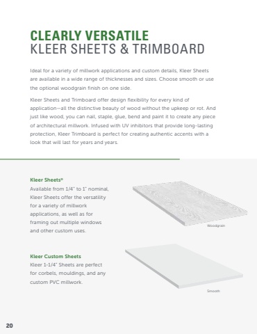 CLEARLY VERSATILEKLEER SHEETS & TRIMBOARDIdeal for a variety of millwork applications and custom details, Kleer Sheets are available in a wide range of thicknesses and sizes. Choose smooth or use the optional woodgrain finish on one side.Kleer Sheets and Trimboard offer design flexibility for every kind of application—all the distinctive beauty of wood without the upkeep or rot. And just like wood, you can nail, staple, glue, bend and paint it to create any piece of architectural millwork. Infused with UV inhibitors that provide long-lasting protection, Kleer Trimboard is perfect for creating authentic accents with a look that will last for years and years.WoodgrainSmoothKleer Sheets®Available from 1/4\Kleer Sheets offer the versatility for a variety of millwork applications, as well as for framing out multiple windows and other custom uses.Kleer Custom SheetsKleer 1-1/4\for corbels, mouldings, and any custom PVC millwork.20