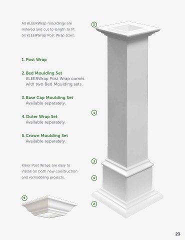All KLEERWrap mouldings are mitered and cut to length to fit all KLEERWrap Post Wrap sizes.Kleer Post Wraps are easy to install on both new construction and remodeling projects.1.Post Wrap2.Bed Moulding SetKLEERWrap Post Wrap comes with two Bed Moulding sets.3.Base Cap Moulding SetAvailable separately.4.Outer Wrap SetAvailable separately.5.Crown Moulding SetAvailable separately.12245323
