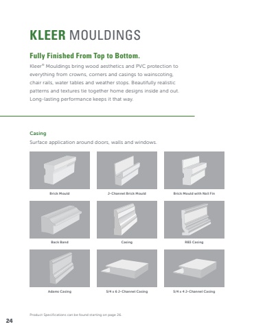 KLEER MOULDINGSKleerĀ® Mouldings bring wood aesthetics and PVC protection to everything from crowns, corners and casings to wainscoting, chair rails, water tables and weather stops. Beautifully realistic patterns and textures tie together home designs inside and out. Long-lasting performance keeps it that way.Fully Finished From Top to Bottom.Brick MouldCasingSurface application around doors, walls and windows.J-Channel Brick MouldBack Band Casing RB3 Casing5/4 x 6 J-Channel Casing 5/4 x 4 J-Channel CasingProduct Specifications can be found starting on page 26.Brick Mould with Nail FinAdams Casing24