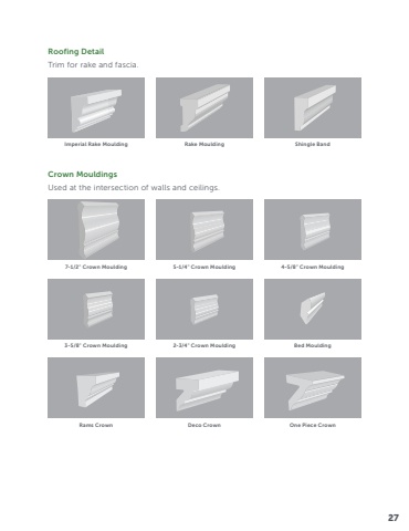 Imperial Rake Moulding Rake Moulding Shingle Band7-1/2\5-1/4\4-5/8\3-5/8\2-3/4\Bed MouldingRams Crown Deco Crown One Piece CrownCrown MouldingsUsed at the intersection of walls and ceilings.Roofing DetailTrim for rake and fascia.27