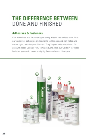 THE DIFFERENCE BETWEENDONE AND FINISHEDOur adhesives and fasteners give every Kleer® a seamless look. Use our variety of adhesives and sealants to fill gaps and nail holes and create tight, weatherproof bonds. They're precisely formulated for use with Kleer Cellular PVC Trim products. Use our Cortex® for Kleer fastener system to make unsightly fastener heads disappear.Adhesives & Fasteners1123 428