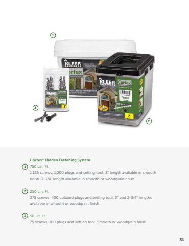 121332Cortex® Hidden Fastening System750 Lin. Ft.1,125 screws, 1,200 plugs and setting tool. 2\finish. 2-3/4\250 Lin. Ft.375 screws, 400 collated plugs and setting tool. 2\available in smooth or woodgrain finish.50 lin. Ft.75 screws, 100 plugs and setting tool. Smooth or woodgrain finish.31