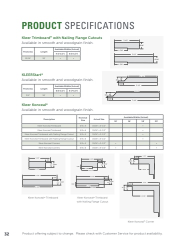 Product offering subject to change. Please check with Customer Service for product availability.PRODUCT SPECIFICATIONSThickness LengthAvailable Widths (Actual)4 (3-1/2\6 (5-1/2\15/16\18' • •Kleer Trimboard® with Nailing Flange CutoutsAvailable in smooth and woodgrain finish. 3-1/2\15/16\1-7/8\5-1/2\15/16\1-7/8\Thickness LengthAvailable Widths (Actual)6 (5-1/2\8 (7-1/2\3/4\18' • •KLEERStart®Available in smooth and woodgrain finish.4-1/4\5-1/2\13/16\1/2\3/4\6-1/4\7-1/2\13/16\1/2\3/4\Description Nominal Size Actual SizeAvailable Widths (Actual)10' 16' 18' 20'Kleer Konceal Trimboard 5/4 x 4 15/16\•Kleer Konceal Trimboard 5/4 x 6 15/16\•Kleer Konceal Trimboard with Nailing Flange Cutout 5/4 x 4 15/16\•Kleer Konceal Trimboard with Nailing Flange Cutout 5/4 x 6 15/16\•Kleer Konceal Corners 5/4 x 4 15/16\• •Kleer Konceal Corners 5/4 x 6 15/16\• •Kleer Konceal®Available in smooth and woodgrain finish.3-1/2\3/4\15/16\3/4\2-3/4\5-1/2\3/4\15/16\3/4\4-3/4\3-1/2\3/4\15/16\3/4\2-3/4\1-7/8\3/16\5-1/2\3/4\15/16\3/4\4-3/4\3-7/8\3/16\3-1/2\3/4\15/16\3/4\1-13/16\5-1/2\3/4\15/16\3/4\3-13/16\Kleer Konceal® Trimboard Kleer Konceal® Trimboard with Nailing Flange CutoutKleer Konceal® Corner32