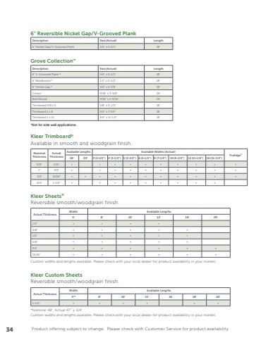 Product offering subject to change. Please check with Customer Service for product availability.Kleer Sheets®Reversible smooth/woodgrain finish.Actual ThicknessWidth Available Lengths4' 8' 10' 12' 18' 20'1/4\• • • •3/8\• • • • •1/2\• • • • •5/8\• • • • •3/4\• • • • • •15/16\• • • • • •Custom widths and lengths available. Please check with your local dealer for product availability in your market.Kleer Custom SheetsReversible smooth/woodgrain finish.Actual ThicknessWidth Available Lengths4'* 8' 10' 12' 16' 18' 20'1-1/4\• • • • • •*Nominal 48\Custom widths and lengths available. Please check with your local dealer for product availability in your market.NominalThicknessActualThicknessAvailable Lengths Available Widths (Actual)TruEdge®18' 20' 3 (2-1/2\4 (3-1/2\5 (4-1/2\6 (5-1/2\8 (7-1/4\10 (9-1/4\12 (11-1/4\16 (15-1/4\5/8\5/8\• • • • • • • • • •1\3/4\• • • • • • • • • •5/4 15/16\• • • • • • • • • • •6/4 1-1/4\• • • • • • • • •Kleer Trimboard®Available in smooth and woodgrain finish.Grove Collection™6\Description Size (Actual) Length6\3/4\18'6\1/2\18'6\3/4\18'Crown 9/16\16'Bed Mould 9/16\16'Trimboard 5/8 x 4 5/8\18'Trimboard 1 x 8 3/4\18'Trimboard 1 x 12 3/4\18'*Not for side wall applications.Description Size (Actual) Length6\3/4\18'34