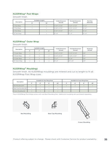 Product offering subject to change. Please check with Customer Service for product availability.KLEERWrap® Post WrapsSmooth finish.DescriptionAvailable Lengths Inside Dimension (Actual)Outside Dimension (Actual)Post Size(Nominal) 8' 10'4\• • 3-3/4\4-1/2\4\6\• • 5-3/4\6-1/2\6\8\• 6-1/4\7\6\10\• 8\9\8\KLEERWrap® Outer WrapSmooth finish.DescriptionAvailable Lengths Inside Dimension (Actual)Outside Dimension (Actual)Thickness(Actual) 5\7\12\4\• • • 4-1/2\5-1/2\1/2\6\• • • 6-1/2\7-1/2\1/2\8\• • • 7\8\1/2\10\• • • 9\10\1/2\KLEERWrap® MouldingsSmooth finish. All KLEERWrap mouldings are mitered and cut to length to fit all KLEERWrap Post Wrap sizes.*Each KLEERWrap Post Wrap comes with two Bed Moulding Sets. Additional moulding sets purchased separately.DescriptionAvailable for Post Wrap Sizes Available for Outer Wrap Sizes4\6\8\10\4\6\8\10\Bed Moulding Set* • • • • • • • •Base Cap Moulding Set • • • •Crown Moulding Set • • • •9/16\3-5/8\11/16\1-1/8\1-9/16\9/16\Bed Moulding Base Cap MouldingCrown Moulding35