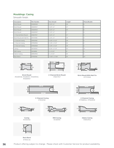Product offering subject to change. Please check with Customer Service for product availability.Description Part Number Size (Actual) Length Pieces/BundleBrick Mould #5180R18 1-1/4\18' 6Brick Mould #5180R17 1-1/4\17' 6Brick Mould #5180R10 1-1/4\10' 6Brick Mould #5180R07 1-1/4\7' 6J-Channel Brick Mould #5657R17 1-1/4\17' 4Brick Mould with Nail Fin #7371R18 1-1/4\18' 4J-Channel Casing #7651R18 1-1/8\18' 2J-Channel Casing #7968R16 1-1/8\16' 2J-Channel Casing #7968R18 1-1/8\18' 2Casing #2351R16 11/16\16' 12RB3 Casing #2369R8 1\8' 4Adams Casing #2852R16 1\16' 2Back Band #7931R16 1-3/8\16' 10Mouldings: CasingSmooth finish.1-1/4\2\1-1/16\Brick Mould#5180R18, #5180R17, #5180R10, #5180R073\2\1-1/4\1\J-Channel Brick Mould#5657R171-3/8\1-7/16\Back Band#7931C163-1/2\1/2\1-1/16\2-1/4\11/16\13/64\3-1/2\1-1/32\19/32\Casing#2351R16RB3 Casing#2369R8Adams Casing#2852R161\1-1/4\3\2\1/8\Brick Mould With Nail Fin#7371R181-1/8\13/16\6-1/2\5-1/2\J-Channel Casing#7651R18J-Channel Casing#7968R16, #7968R181-1/8\3-1/2\4-1/2\13/16\36