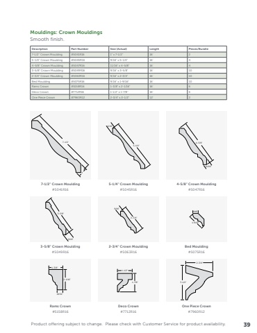 Product offering subject to change. Please check with Customer Service for product availability.Mouldings: Crown MouldingsSmooth finish.Description Part Number Size (Actual) Length Pieces/Bundle7-1/2\#5041R16 1\16' 25-1/4\#5045R16 9/16\16' 44-5/8\#5047R16 11/16\16' 43-5/8\#5049R16 9/16\16' 102-3/4\#5063R16 9/16\16' 10Bed Moulding #5075R16 9/16\16' 10Rams Crown #5158R16 1-3/8\16' 6Deco Crown #7712R16 1-1/2\16' 6One Piece Crown #7960R12 2-3/4\12' 29/16\2-3/4\11/16\4-5/8\5-1/4\9/16\1\7-1/2\1-1/2\1-7/8\3-1/2\2-3/4\1-3/8\2-1/16\19/32\9/16\3-5/8\1-9/16\9/16\7-1/2\#5041R165-1/4\#5045R164-5/8\#5047R163-5/8\#5049R162-3/4\#5063R16Bed Moulding#5075R16Rams Crown#5158R16Deco Crown#7712R16One Piece Crown#7960R1239