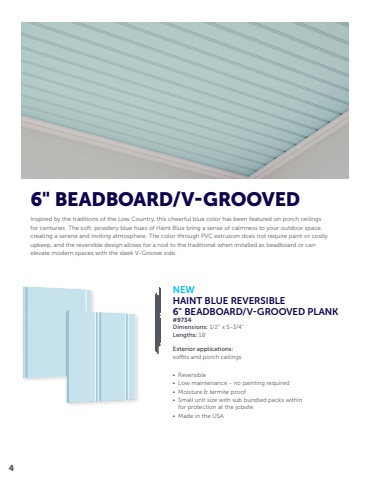 NEWHAINT BLUE REVERSIBLE6\#9734Dimensions: 1/2\Lengths: 18'Exterior applications:soffits and porch ceilings• Reversible• Low maintenance - no painting required• Moisture & termite proof• Small unit size with sub bundled packs withinfor protection at the jobsite• Made in the USAInspired by the traditions of the Low Country, this cheerful blue color has been featured on porch ceilings for centuries. The soft, powdery blue hues of Haint Blue bring a sense of calmness to your outdoor space, creating a serene and inviting atmosphere. The color through PVC extrusion does not require paint or costly upkeep, and the reversible design allows for a nod to the traditional when installed as beadboard or can elevate modern spaces with the sleek V-Groove side. 6\4