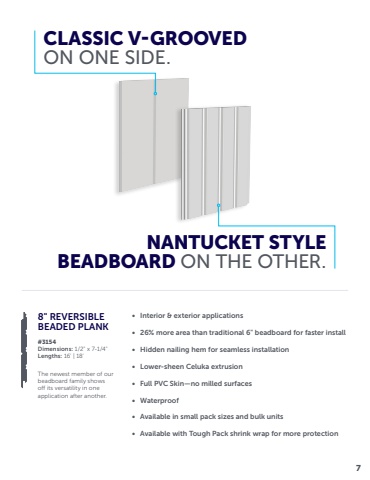 #3154Dimensions: 1/2\Lengths: 16' | 18'The newest member of our beadboard family shows off its versatility in one application after another.• Interior & exterior applications• 26% more area than traditional 6\• Hidden nailing hem for seamless installation• Lower-sheen Celuka extrusion• Full PVC Skin—no milled surfaces• Waterproof• Available in small pack sizes and bulk units• Available with Tough Pack shrink wrap for more protectionNANTUCKET STYLEBEADBOARD ON THE OTHER.CLASSIC V-GROOVEDON ONE SIDE.8\BEADED PLANK7