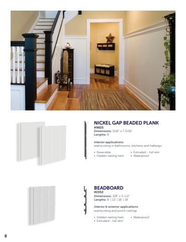 NICKEL GAP BEADED PLANK#9825Dimensions: 5/16\Lengths: 8'Interior applications:wainscoting in bathrooms, kitchens and hallways• Reversible• Hidden nailing hem• Extruded - full skin• WaterproofBEADBOARD#2352Dimensions: 3/8\Lengths: 8' | 12' | 16' | 18'Interior & exterior applications:wainscoting and porch ceilings• Hidden nailing hem• Extruded - full skin• Waterproof8
