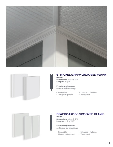 6\#9990Dimensions: 3/4\Lengths: 16' | 18'Exterior applications:soffits & porch ceilings• Extruded - full skin• Waterproof• Reversible• Tongue & grooveBEADBOARD/V-GROOVED PLANK#9734Dimensions: 1/2\Lengths: 12' | 16' | 18'Exterior applications:soffits and porch ceilings• Reversible• Hidden nailing hem• Extruded - full skin• Waterproof11