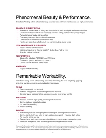 5* Please see TruExterior Siding & Trim Limited Warranties and Product Data Sheets for proprietary test results, located at TruExterior.com.The warranties found there are the sole warranties applicable to TruExterior products Always follow local building codes and constructionbest practices. See the complete Installation Guidelines for TruExterior Siding & Trim at TruExterior.com.BEAUTY IS IN EVERY DETAIL Available in a wide range of siding and trim profiles in both woodgrain and smooth finishes Craftsman Collection™ features historically accurate siding profiles in bold, crisp shapes Authentic look of cedar siding profiles Enables tighter gaps due to minimal movement Corners can be mitered to create clean lines Paint in any color to create the look you want, including darker tonesLOW MAINTENANCE & DURABILITY Resists rot and termite attacks* Maintains high level of thermal stability* - better than PVC or vinyl Absorbs minimal moisture*PERFORMANCE Class A fire rated per ASTM E84 and WUI listed Suitable for ground and masonry contact Can be used in moisture-prone areasWARRANTY 20 year limited warrantyPhenomenal Beauty & Performance.TruExterior® Siding & Trim offers historically accurate looks with low maintenance and high performance.TOOLS Easy to work with, cut and mill Installed using proven woodworking tools and methods Carbide-tipped blades and bits are recommended for a longer tool lifeFASTENING Accepts common high-quality, exterior-grade fasteners Can be fastened close to the edge No need for pre-drilling Resists splitting PAINTING TruExterior products come pre-primed and require painting to finish the look Can be painted with any color of high-grade exterior paint – including dark colors No need to prime end cut Paint adheres well due to the thermal stability and the minimal moisture absorption Promotes exceptional paint durability, paint lasts longer than on wood*Remarkable Workability.TruExterior Siding & Trim offers lasting look while eliminating the need for gluing, gapping and other cumbersome and costly installation techniques.