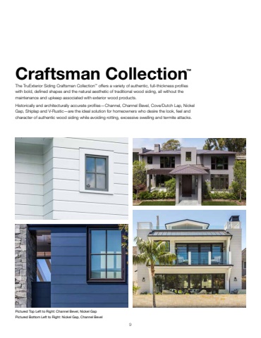 9Craftsman Collection™The TruExterior Siding Craftsman Collection™ offers a variety of authentic, full-thickness profiles with bold, defined shapes and the natural aesthetic of traditional wood siding, all without the maintenance and upkeep associated with exterior wood products.Historically and architecturally accurate profiles—Channel, Channel Bevel, Cove/Dutch Lap, Nickel Gap, Shiplap and V-Rustic—are the ideal solution for homeowners who desire the look, feel and character of authentic wood siding while avoiding rotting, excessive swelling and termite attacks.Pictured Top Left to Right: Channel Bevel, Nickel GapPictured Bottom Left to Right: Nickel Gap, Channel Bevel