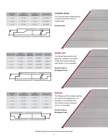 11BCANominalSizeActual Thickness (A)ActualWidth (B) Reveal (C)1 x 6 11/16\5-1/2\4-31/32\1 x 8 11/16\7-1/2\6-31/32\1 x 10 11/16\9-1/2\8-31/32\NominalSizeActual Thickness (A)ActualWidth (B) Reveal (C)1 x 4 11/16\3-1/2\3\1 x 6 11/16\5-1/2\5\1 x 8 11/16\7-1/4\6-3/4\1 x 10 11/16\9-1/4\8-3/4\BACCBDANominal Size Actual Thickness (A)Actual Width (B) Reveal (C) Gap (D)1 x 4 11/16\3-1/2\3-3/32\5/64\1 x 6 11/16\5-1/2\5-3/32\5/64\1 x 8 11/16\7-1/4\6-13/16\5/64\1 x 10 11/16\9-1/4\8-13/16\5/64\TruExterior Siding comes pre-primed and does require paint.CHANNEL BEVELThe Channel Bevel profile featuresa channel-style joint with an angled edge.Smooth FinishNICKEL GAPThe Nickel Gap profile is selfgapping, creating a consistent nickel-sized space between each board. Is not reversible.Smooth Finish orWoodgrain FinishSHIPLAPThe Shiplap profile is edge-matched for a tight joint appearance. It is intended to be installed with the finished surface exposed and is not reversible.Smooth Finish orC Woodgrain FinishBA