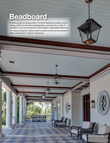 12BeadboardIncluding single and double profiles, TruExterior Beadboard is ideal for porch ceilings, soffits and decorative wall applications, and allows for a variety of installations, as it can be attached in either parallel or perpendicular directions.Its “tongue-and-groove” design results in a clean look that can be reversed to offer a contemporary “V-groove” appearance.Pictured: V-Groove Pattern