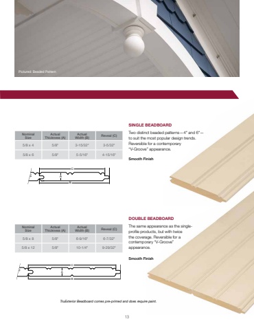 13SINGLE BEADBOARDTwo distinct beaded patterns—4\to suit the most popular design trends. Reversible for a contemporary “V-Groove” appearance.Smooth FinishNominalSizeActual Thickness (A)ActualWidth (B) Reveal (C)5/8 x 4 5/8\3-15/32\3-5/32\5/8 x 6 5/8\5-5/16\4-15/16\BACNominalSizeActual Thickness (A)ActualWidth (B) Reveal (C)5/8 x 8 5/8\6-9/16\6-7/32\5/8 x 12 5/8\10-1/4\9-29/32\ABCDOUBLE BEADBOARDThe same appearance as the singleprofile products, but with twice the coverage. Reversible for a contemporary “V-Groove” appearance.Smooth FinishTruExterior Beadboard comes pre-primed and does require paint.Pictured: Beaded Pattern