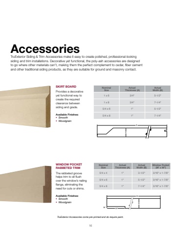 16SKIRT BOARDProvides a decorative yet functional way to create the required clearance between siding and grade.Available Finishes: Smooth WoodgrainWINDOW POCKET RABBETED TRIMThe rabbeted groove helps trim to sit flush over the window’s nailing flange, eliminating the need for cuts or shims.Available Finishes: Smooth WoodgrainNominalSizeActual Thickness (A)ActualWidth (B)Window Pocket(W' x W\5/4 x 4 1\ 3-1/2\3/16\5/4 x 6 1\ 5-1/2\3/16\5/4 x 8 1\ 7-1/4\3/16\Nominal SizeActual Thickness (A)Actual Width (B)1 x 6 3/4\5-1/2\1 x 8 3/4\7-1/4\5/4 x 6 1\ 5-1/2\5/4 x 8 1\ 7-1/4\BABW W\ 'AAccessoriesTruExterior Siding & Trim Accessories make it easy to create polished, professional-looking siding and trim installations. Decorative yet functional, the poly-ash accessories are designed to go where other materials can’t, making them the perfect complement to cedar, fiber cement and other traditional siding products, as they are suitable for ground and masonry contact.TruExterior Accessories come pre-primed and do require paint.