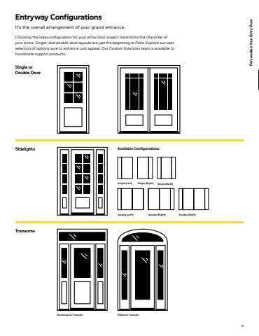 19Personalize Your Entry DoorEntryway ConfigurationsChoosing the ideal configuration for your entry door project transforms the character of your home. Single- and double-door layouts are just the beginning at Pella. Explore our vast selection of options sure to enhance curb appeal. Our Custom Solutions team is available to coordinate support products.It’s the overall arrangement of your grand entrance.Single or Double DoorSidelights Available Configurations:Single (Left) Single (Right) Single (Both) Double (Left) Double (Right) Double (Both) TransomsRectangular Transom Elliptical Transom