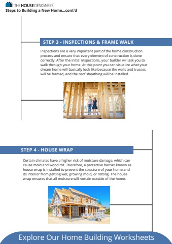 STEP 3 - INSPECTIONS & FRAME WALKInspections are a very important part of the home constructionprocess and ensure that every element of construction is donecorrectly. After the initial inspections, your builder will ask you towalk through your home. At this point you can visualize what yourdream home will basically look like because the walls and trusseswill be framed, and the roof sheathing will be installed.Certain climates have a higher risk of moisture damage, which cancause mold and wood rot. Therefore, a protective barrier known ashouse wrap is installed to prevent the structure of your home andits interior from getting wet, growing mold, or rotting. The housewrap ensures that all moisture will remain outside of the home.STEP 4 - HOUSE WRAPSteps to Building a New Home...cont'dExplore Our Home Building Worksheets
