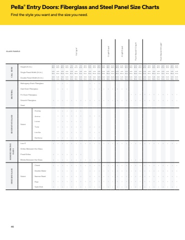 46 Pella® Entry Doors: Fiberglass and Steel Panel Size Charts Find the style you want and the size you need.GLASS PANELS Full Light* 3 Light Equal 4 Light Equal Flush Glazed 1/2 Light Flush Glazed 3/4 Light* CALL SIZESHeight (ft./in.) 6-ft. 8-in.6-ft. 8-in.6-ft. 8-in.6-ft. 8-in.7-ft. 0-in.7-ft. 0-in.7-ft. 0-in.8-ft. 0-in.8-ft. 0-in.8-ft. 0-in.8-ft. 0-in.6-ft. 8-in.6-ft. 8-in.6-ft. 8-in.6-ft. 8-in.6-ft. 8-in.6-ft. 8-in.6-ft. 8-in.6-ft. 8-in.6-ft. 8-in.6-ft. 8-in.6-ft. 8-in.6-ft. 8-in.6-ft. 8-in.8-ft. 0-in.8-ft. 0-in.8-ft. 0-in.8-ft. 0-in.Single-Panel Width (ft./in.) 2-ft. 6-in.2-ft. 8-in.2-ft. 10-in.3-ft. 0-in.2-ft. 8-in.2-ft. 10-in.3-ft. 0-in.2-ft. 6-in.2-ft. 8-in.2-ft. 10-in.3-ft. 0-in.2-ft. 8-in.2-ft. 10-in.3-ft. 0-in.2-ft. 8-in.2-ft. 10-in.3-ft. 0-in.2-ft. 8-in.2-ft. 10-in.3-ft. 0-in.2-ft. 6-in.2-ft. 8-in.2-ft. 10-in.3-ft. 0-in.2-ft. 6-in.2-ft. 8-in.2-ft. 10-in.3-ft. 0-in.Double-Panel Width (ft./in.) 5-ft. 0-in.5-ft. 4-in.5-ft. 8-in.6-ft. 0-in.5-ft. 4-in.5-ft. 8-in.6-ft. 0-in.5-ft. 0-in.5-ft. 4-in.5-ft. 8-in.6-ft. 0-in.5-ft. 4-in.5-ft. 8-in.6-ft. 0-in.5-ft. 4-in.5-ft. 8-in.6-ft. 0-in.5-ft. 4-in.5-ft. 8-in.6-ft. 0-in.5-ft. 0-in.5-ft. 4-in.5-ft. 8-in.6-ft. 0-in.5-ft. 0-in.5-ft. 4-in.5-ft. 8-in.6-ft. 0-in.MATERIALMahogany-Grain Fiberglass • • • • • •Oak-Grain Fiberglass • • • • • • • • • • • •Fir-Grain Fiberglass • • • • • • • • • • •Smooth Fiberglass • • • • • • • • • • • • • • • • • • • • • • • • • • • •SteelDECORATIVE GLASSSelectHuxley • • • • • •Avoca • • • • • • • • •Lucas • • • • • •Tune • • • • • • • • •Lovilia • • • • • • • • •Danbury • • • • • • • • •NONDECORATIVE GLASS Low-E • • • • • • • • • • • • • • • • • • • • • • • • • • • •Grilles-Between-the-GlassFixed Grilles • • • • • • •Blinds-Between-the-Glass • • • • • • • • • • • • • •OBSCURE GLASSSelectChord • • • • • • • • • • • • • • • • • • • • • • • • • • • •Double Water • • • • • • • • • • • • • • • • • • • • • • • • • •Narrow Reed • • • • • • • • • • • • • • • • • • • • • • • • • •Pear • • • • • • • • • • • • • • • • • • • • • • • • • • • •Satin Etch • • • • • • • • • • • • • • • • • • • • • • • • • • • •