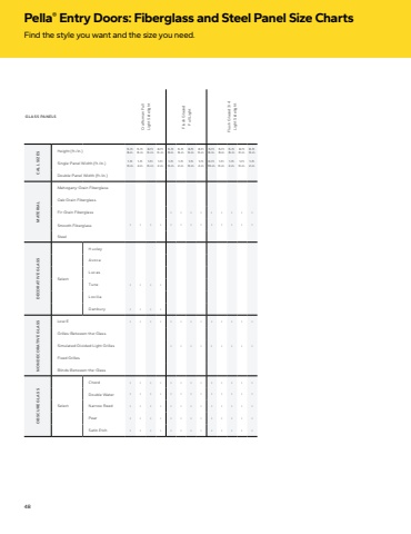 48 Pella® Entry Doors: Fiberglass and Steel Panel Size Charts Find the style you want and the size you need.GLASS PANELS Craftsman Full Light Sidelight Flush Glazed Full Light Flush Glazed 3/4 Light Sidelight CALL SIZESHeight (ft./in.) 6-ft. 8-in.6-ft. 8-in.8-ft. 0-in.8-ft. 0-in.6-ft. 8-in.6-ft. 8-in.8-ft. 0-in.8-ft. 0-in.6-ft. 8-in.6-ft. 8-in.6-ft. 8-in.8-ft. 0-in.8-ft. 0-in.Single-Panel Width (ft./in.) 1-ft. 0-in.1-ft. 2-in.1-ft. 0-in.1-ft. 2-in.1-ft. 0-in.1-ft. 2-in.1-ft. 0-in.1-ft. 2-in.0-ft. 10-in.1-ft. 0-in.1-ft. 2-in.1-ft. 0-in.1-ft. 2-in.Double-Panel Width (ft./in.)MATERIALMahogany-Grain FiberglassOak-Grain FiberglassFir-Grain Fiberglass • • • • • • • • •Smooth Fiberglass • • • • • • • • • • • • •SteelDECORATIVE GLASSSelectHuxleyAvocaLucasTune • • • •LoviliaDanbury • • • •NONDECORATIVE GLASS Low-E • • • • • • • • • • • • •Grilles-Between-the-GlassSimulated-Divided-Light Grilles • • • • • • • • •Fixed GrillesBlinds-Between-the-GlassOBSCURE GLASSSelectChord • • • • • • • • • • • • •Double Water • • • • • • • • • • • • •Narrow Reed • • • • • • • • • • • • •Pear • • • • • • • • • • • • •Satin Etch • • • • • • • • • • • • •