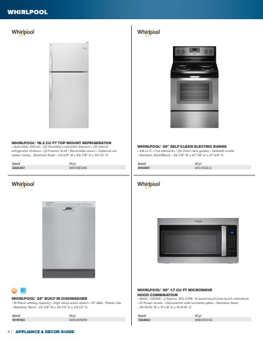 4 | APPLIANCE & DECOR GUIDE PRODUCT CATEGORYWHIRLPOOL® 18.2 CU FT TOP-MOUNT REFRIGERATOR• Automatic defrost • (2) Humidity-controlled drawers • (3) Interior refrigerator shelves • (1) Freezer shelf • Reversible doors • Optional ice maker ready • Stainless Steel • 29-3/4\Item# Mfg#5025297 WRT318FZDMWHIRLPOOL® 30\• 4.8 cu ft • Coil elements • (5) Oven rack guides • Sabbath mode • Stainless Steel/Black • 29-7/8\Item# Mfg#8194491 WFC315S0JSWHIRLPOOL® 24\• 12-Place setting capacity • High-temp wash option • 57 dBA • Plastic tub • Stainless Steel • 23-7/8\Item# Mfg#10191194 WDF341PAPMWHIRLPOOL® 30\HOOD COMBINATION• Watts: 1,000W • 2-Speed, 300 CFM • 6 Quick-touch/one-touch selections • 10 Power levels • Dishwasher-safe turntable plate • Stainless Steel • 29-15/16\Item# Mfg#7264863 WMH31017HSWHIRLPOOL