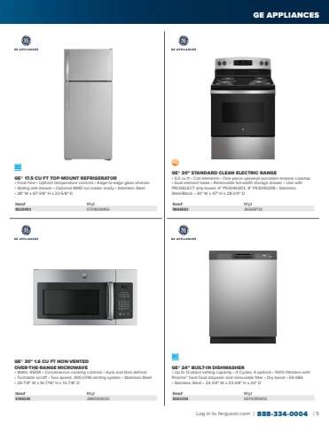 Log in to ferguson.com | 888-334-0004 | 5PRODUCT CATEGORYGE® 17.5 CU FT TOP-MOUNT REFRIGERATOR• Frost free • Upfront temperature controls • Edge-to-edge glass shelves • Sliding deli drawer • Optional IM4D ice maker ready • Stainless Steel • 28\Item# Mfg#8026993 GTE18GSNRSSGE® 30\• 5.0 cu ft • Coil elements • One-piece upswept porcelain-enamel cooktop • Dual element bake • Removable full-width storage drawer • Use with PROSELECT drip bowls: 6\Steel/Black • 30\Item# Mfg#9866582 JB256RTSSGE® 30\OVER-THE-RANGE MICROWAVE• Watts: 950W • Convenience cooking controls • Auto and time defrost • Turntable on/off • Two-speed, 300-CFM venting system • Stainless Steel • 29-7/8\Item# Mfg#5148340 JNM3163RJSSGE® 24\• Up to 12-place setting capacity • 4 Cycles, 4 options • 100% filtration with Piranha™ hard food disposer and removable filter • Dry boost • 59 dBA • Stainless Steel • 23-3/4\Item# Mfg#9263394 GDF510PSRSSGE APPLIANCES