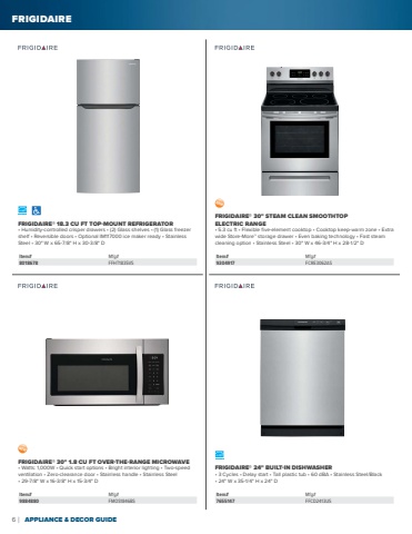 6 | APPLIANCE & DECOR GUIDE PRODUCT CATEGORYFRIGIDAIRE® 18.3 CU FT TOP-MOUNT REFRIGERATOR• Humidity-controlled crisper drawers • (2) Glass shelves • (1) Glass freezer shelf • Reversible doors • Optional IM117000 ice maker ready • Stainless Steel • 30\Item# Mfg#8018678 FFHT1835VSFRIGIDAIRE® 30\ELECTRIC RANGE• 5.3 cu ft • Flexible five-element cooktop • Cooktop keep-warm zone • Extra wide Store-More™ storage drawer • Even baking technology • Fast steam cleaning option • Stainless Steel • 30\Item# Mfg#9304917 FCRE3062ASFRIGIDAIRE® 30\• Watts: 1,000W • Quick start options • Bright interior lighting • Two-speed ventilation • Zero-clearance door • Stainless handle • Stainless Steel • 29-7/8\Item# Mfg#9884880 FMOS1846BSFRIGIDAIRE® 24\• 3 Cycles • Delay start • Tall plastic tub • 60 dBA • Stainless Steel/Black • 24\Item# Mfg#7655147 FFCD2413USFRIGIDAIRE