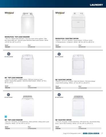 Log in to ferguson.com | 888-334-0004 | 7PRODUCT CATEGORYWHIRLPOOL® TOP LOAD WASHER• 3.8 cu ft • Water level selection • Two-way wash action agitator • Max spin speed 680 rpm • Smooth spiral Stainless Steel wash basket • White • 27-1/2\Item# Mfg#7503604 WTW4855HWWHIRLPOOL® ELECTRIC DRYER• Electric • 7.0 cu ft • AutoDry™ drying system • 12 Dryer cycles • 3 Temperatures • 3 Options • White • 29\Item# Mfg#7544932 WED4850HWGE® TOP LOAD WASHER• 3.8 cu ft • 10 Cycles • 4 Water levels • 700 rpm maximum spin speed • Heavy-duty agitator • Stainless Steel basket • White • 27\44\Item# Mfg#7055346 GTW220ACKWWGE® ELECTRIC DRYER• Electric • 6.2 cu ft • 3 Cycles • Auto dry feature • Flat back design • Up to 120 ft venting • White • 27\Item# Mfg#7055378 GTX22EASKWWGE® TOP LOAD WASHER• 4.6 cu ft • 13 Cycles • 6 Temperatures • Stain pretreat • Deep clean cycle • Deep fill • White • 27\Item# Mfg#7798379 GTW500ASNWSGE® ELECTRIC DRYER• 7.2 cu ft • 4 Cycles • 4 Heat selections • HE sensor dry • Aluminized alloy drum • Up to 120 ft venting • White • 27\Item# Mfg#5148363 GTD45EASJWSLAUNDRY