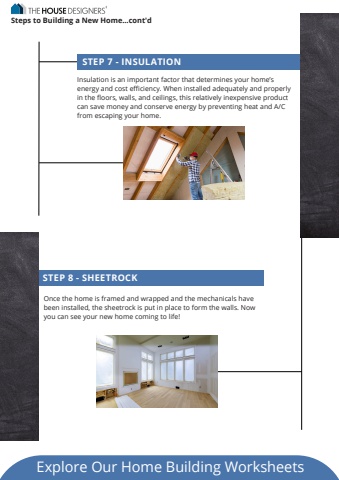 STEP 7 - INSULATIONInsulation is an important factor that determines your home’senergy and cost efficiency. When installed adequately and properlyin the floors, walls, and ceilings, this relatively inexpensive productcan save money and conserve energy by preventing heat and A/Cfrom escaping your home.Once the home is framed and wrapped and the mechanicals havebeen installed, the sheetrock is put in place to form the walls. Nowyou can see your new home coming to life!STEP 8 - SHEETROCKSteps to Building a New Home...cont'dExplore Our Home Building Worksheets