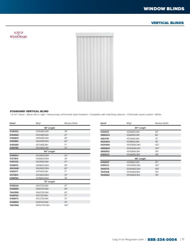 Log in to ferguson.com | 888-334-0004 | 17PRODUCT CATEGORYSTANDARD VERTICAL BLIND• 3-1/2\valance • Child-safe wand control • White VERTICAL BLINDSWINDOW BLINDSItem# Mfg# Window Width48\5149302 VS3548SCWH 35\5149065 VS4748SCWH 47\5148829 VS5948SCWH 59\5148983 VS6348SCWH 63\5149289 VS7148SCWH 71\5148798 VS7248SCWH 72\60\5148933 VS2360SCWH 23\4737814 VS3560SCWH 35\5149139 VS4760SCWH 47\5148915 VS5960SCWH 59\4542464 VS6360SCWH 63\5149371 VS7160SCWH 71\4737812 VS7260SCWH 72\5148764 VS7860SCWH 78\72\5149226 VS4772SCWH 47\5148989 VS5972SCWH 59\7642995 VS6372SCWH 63\5148754 VS7172SCWH 71\5148973 VS7272SCWH 72\5148859 VS7872SCWH 78\7642968 VS10272SCWH 102\Item# Mfg# Window Width84\5149073 VS5984SCWH 59\4808324 VS6684SCWH 66\4503701 VS7284SCWH 72\4420424 VS7884SCWH 78\4420446 VS10284SCWH 102\4808838 VS10484SCWH 104\4808552 VS11084SCWH 110\5149232 VS11684SCWH 116\96\5149007 VS7896SCWH 78\5149123 VS10296SCWH 102\7643174 VS10496SCWH 104\7643168 VS11096SCWH 110\7643052 VS11696SCWH 116\