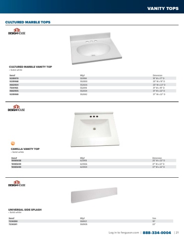 Log in to ferguson.com | 888-334-0004 | 21PRODUCT CATEGORYCULTURED MARBLE VANITY TOP• Solid white Item# Mfg# Dimension9209970 551994 19\9209968 552000 25\4663934 552026 25\7500165 552018 31\4663935 552034 31\9209969 552042 37\CAMILLA VANITY TOP• Solid white Item# Mfg# Dimension10085438 623918 25\10085439 623926 31\10085440 623934 37\UNIVERSAL SIDE SPLASH• Solid white Item# Mfg# Size7234250 550921 19\7234241 550905 22\CULTURED MARBLE TOPSVANITY TOPS