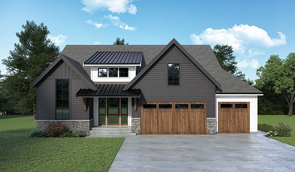 House Plan 9856 has a neat rectangular footprint and stacks its 2,124 square feet on two stories—that's a recipe for an affordable build! The first level includes the open-concept living spaces, a spacious foyer, an office, and a mudroom/laundry room coming in the side entrance, complete with a powder room. All three bedrooms including the vaulted master suite are located upstairs.