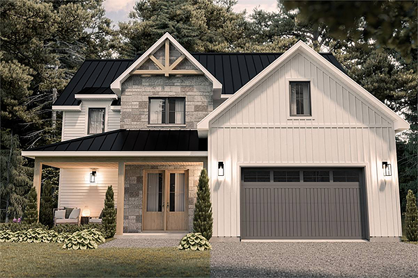 House Plan 6519 makes a great choice if you need to condense your home's footprint. It offers 2,178 square feet with an open floor plan and a traditional split between living and sleeping quarters. The main level places the garage and foyer with storage in front to conceal the interior from the street. Step farther in and you'll find an island kitchen, a voluminous living room, and an office and powder room tucked on the side. The master suite, two secondary bedrooms, a hall bath, a den, and the laundry are placed on the second story. This design really packs a lot!
