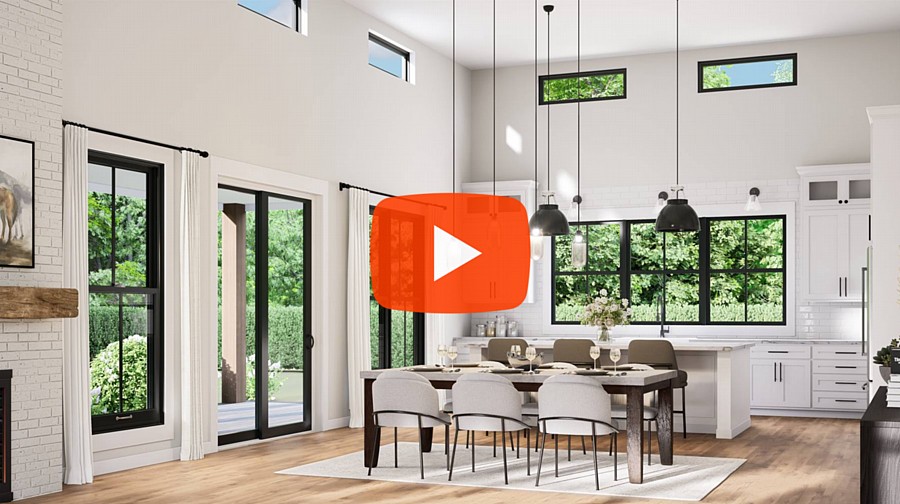 House Plan 6693 is a lovely barndominium design with 2,000 square feet, three bedrooms, and two-and-a-half baths to serve a family well. Just look at how the common areas are totally open concept and have a 16' ceiling with clerestory windows to really brighten the room! The bedrooms include a four-piece primary suite and a pair that share a Jack-and-Jill bath. They're spread across the hallway that also includes the powder room, laundry room, storage built-ins, and access to the garage.