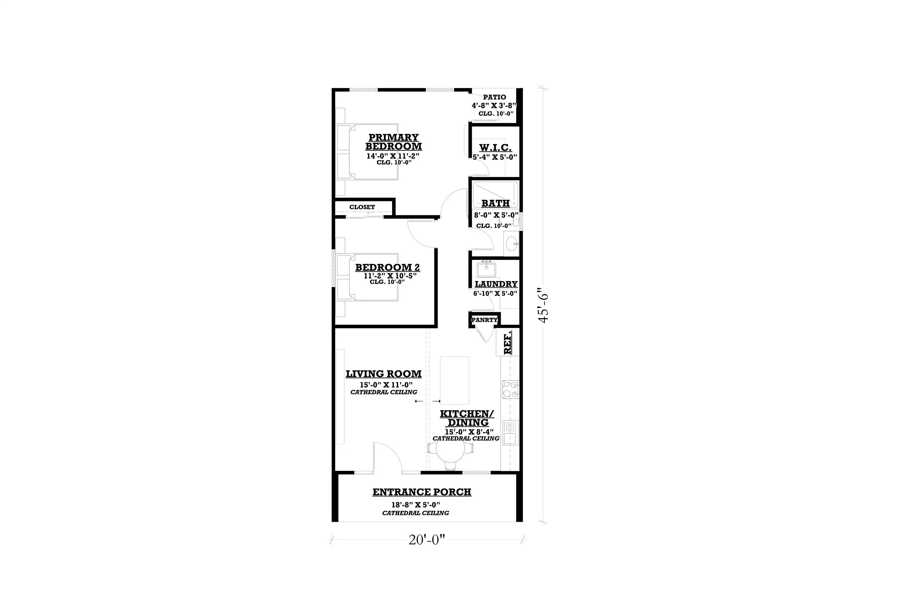 Two bedrooms sit to one side of the home, with the primary bedroom featuring a walk-in closet and direct access to the back patio for a private retreat. A shared full bathroom and a dedicated laundry area complete the design, providing everything you need in a compact, easy-to-maintain footprint.