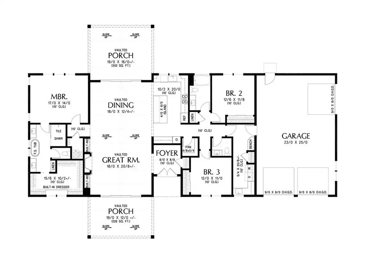 Blending barndominium and ranch appeal, House Plan 10285 offers a wonderful design for today's families! It includes 2,310 square feet with three bedrooms and two-and-a-half bathrooms in a split layout as well as a sizeable three-car garage with two bays accessible from the front and one from the side. When you step in through the front door, you'll find a cozy foyer area with a coat closet. The great room beside this spans the full depth of the house, with living space with a fireplace and built-ins in front and dining space in the back, all beneath a grand cathedral vaulted ceiling. That vaulted ceiling continues out over the front and back porches to extend livability into the fresh air, too! The U-shaped island kitchen sits next to the dining area and has plenty of room to work. Take the hallway behind it to find two bedrooms, a full hall bath, a powder room, and a large laundry/mudroom that connects to the garage. Clear across the house, the primary suite has its privacy. It features a large bedroom, a five-piece bathroom, and a large walk-in closet. This home packs plenty of style and functionality into a modest size for wide appeal!