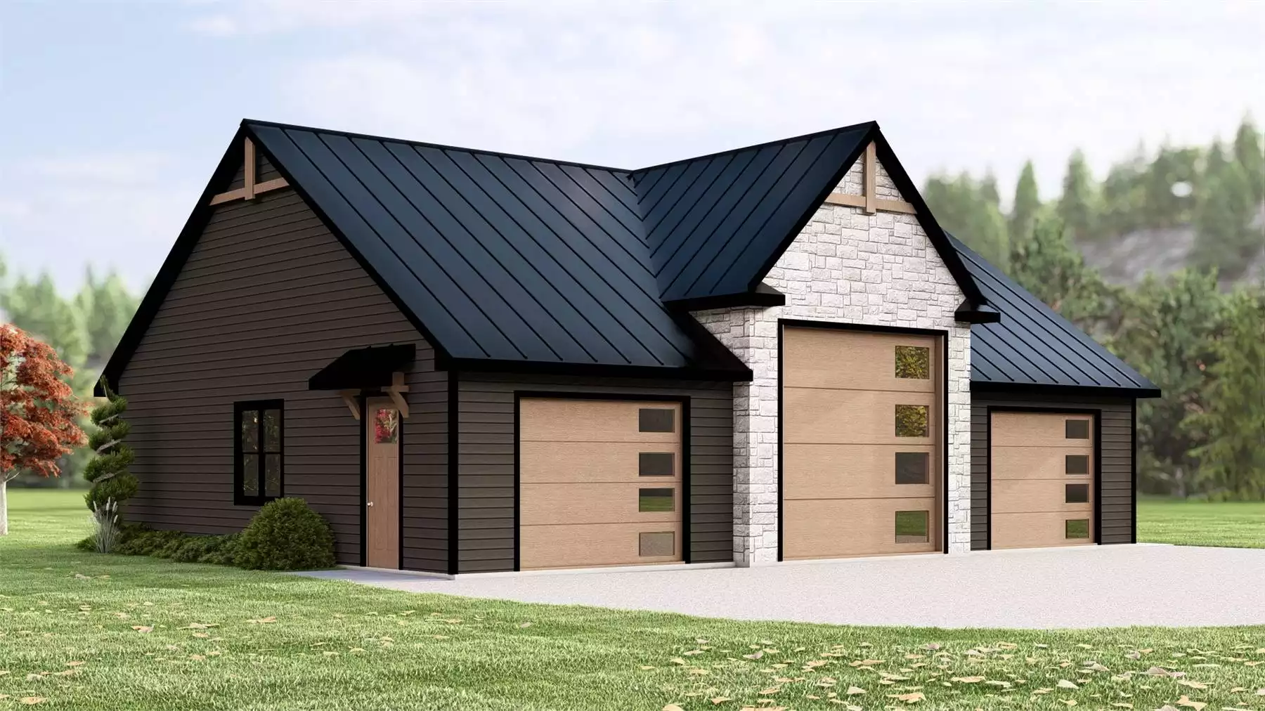 Jasper Creek is a versatile 3-car garage plan designed to combine functionality, storage, and modern curb appeal in a compact footprint. Offering 1,866 square feet, this detached garage provides ample room for vehicles, tools, and seasonal equipment, making it ideal for homeowners who need extra storage or workspace. The front-entry layout allows for easy driveway access, while the interior includes a dedicated storage area to keep everything organized and out of the way. With 10-foot main floor ceiling heights, the design accommodates larger vehicles, overhead storage, or workshop setups. The exterior blends contemporary, modern, and Craftsman influences, highlighted by a steep roof pitch for added architectural interest. This garage plan works well as a standalone structure, home addition, or companion building on rural or suburban properties. Jasper Creek is a smart solution for expanding storage without sacrificing style.