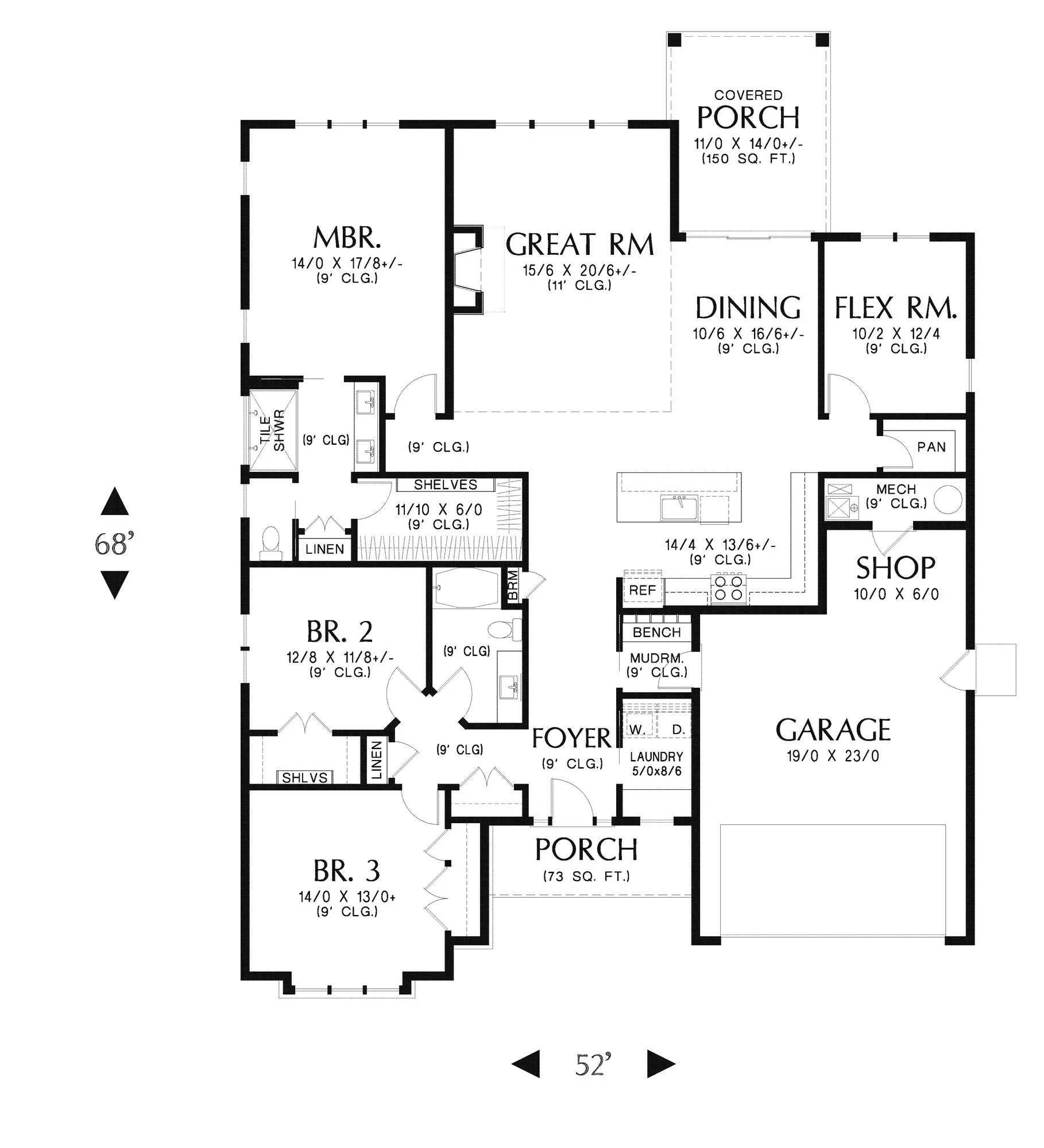 If you need a low-profile contemporary ranch for your family, consider House Plan 2348. It offers 2,272 square feet with three bedrooms, open-concept living, and a flex room. When you step inside, you'll find the laundry room and mudroom coming in from the garage on one side and two bedrooms with a shared hall bath on the other. The great room comprising the island kitchen, casual dining area, and living space with a raised ceiling is in back. The master suite sits in a corner and boasts windows on two sides, a four-piece bath with a tile shower, and a large walk-in closet. The flex room is privately placed off the dining area and could be an office, craft room, or another bedroom. House Plan 2348 has a compact shape that's perfect for building in neighborhoods or anywhere else, so it makes a great midsize choice for most!